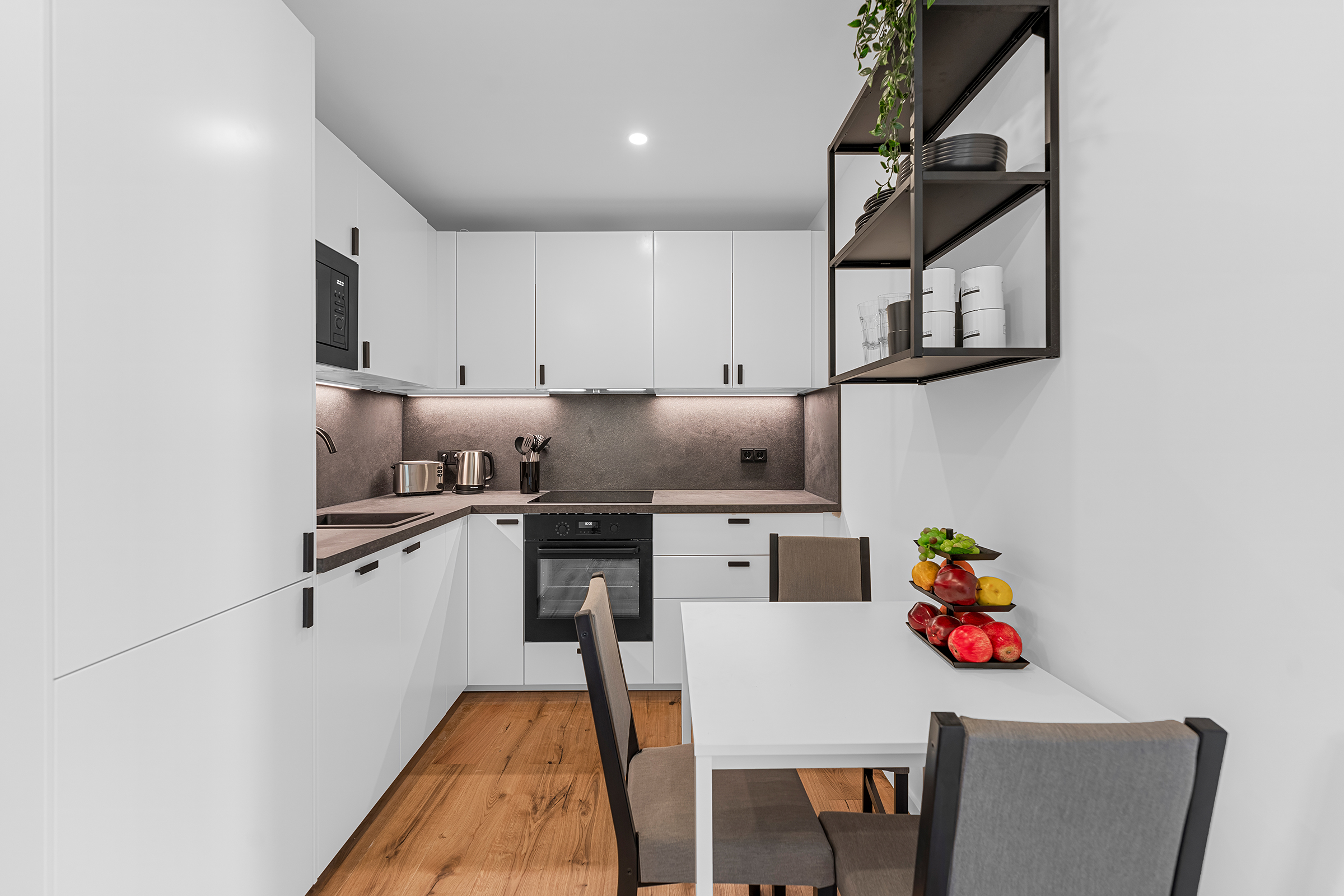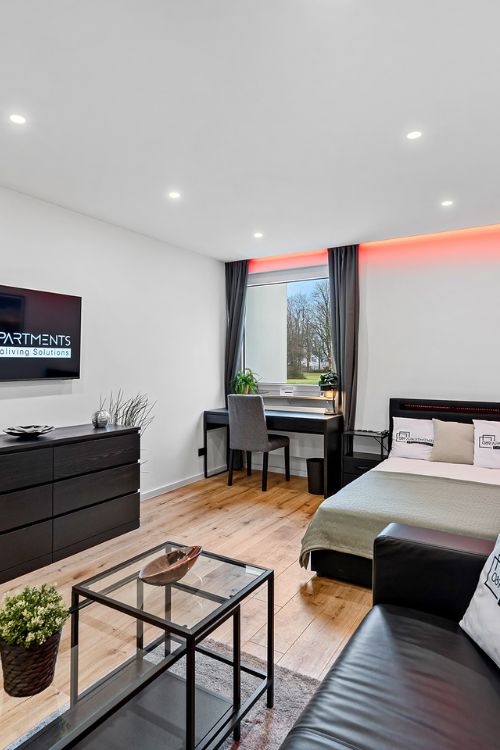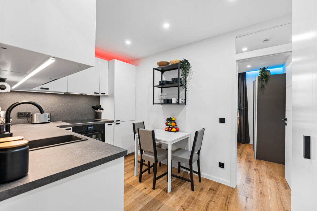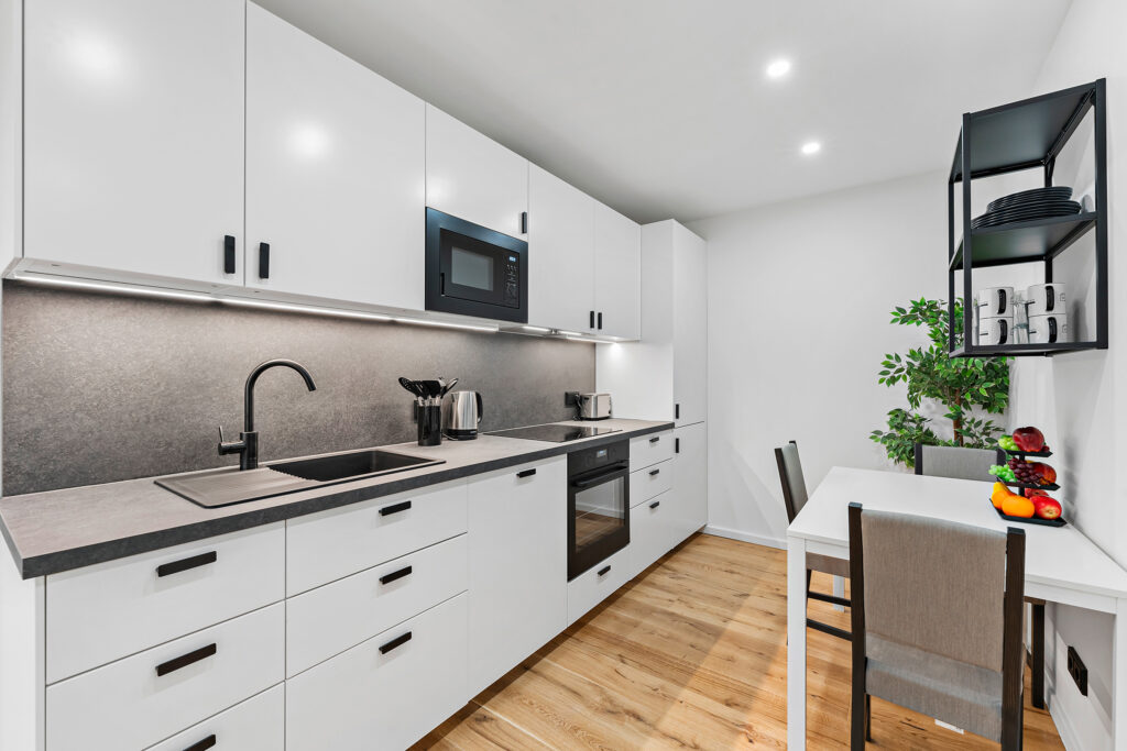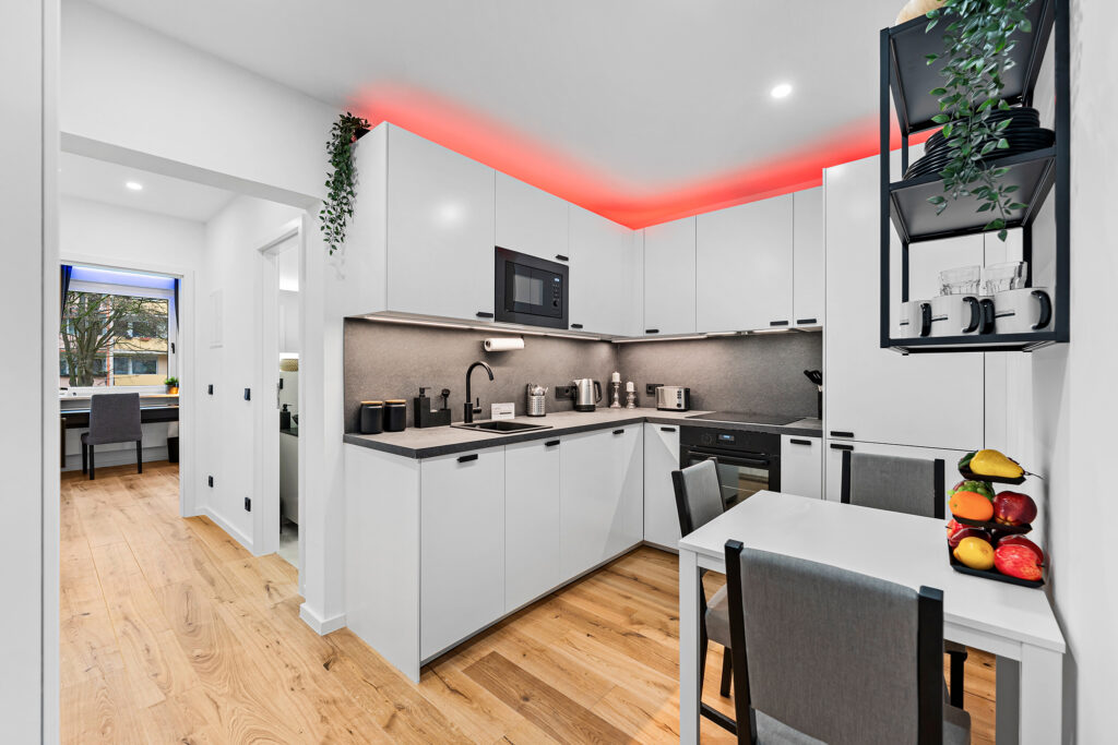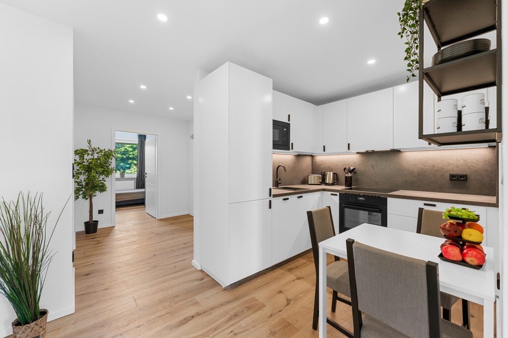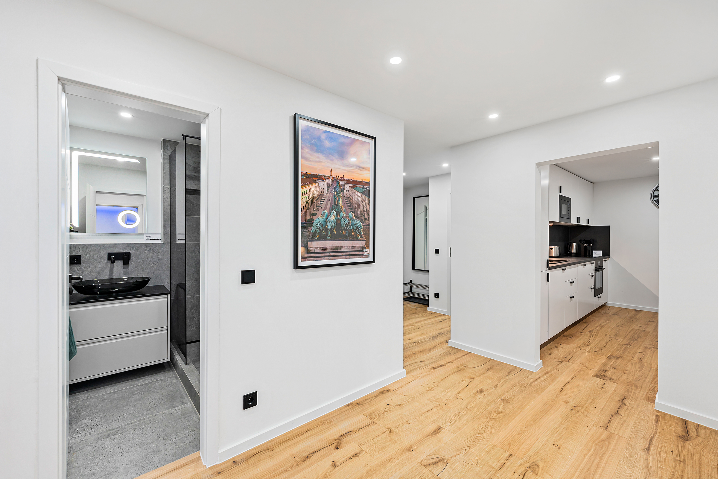 Alle Immobilien werden als hochwertiges Co-Living-Wohnkonzept realisiert und vollständig möbliert vermietet. Die aufwendige Sanierung sorgt für ein Wohngefühl, das sofort überzeugt: verklebtes Parkett mit warmer Anmutung, fein abgestimmte Lichtkonzepte mit LED-Spots und Schattenfugen, moderne Bäder mit großformatigen Fliesen und integrierten Ablagen sowie stilvoll ausgestattete Küchen.